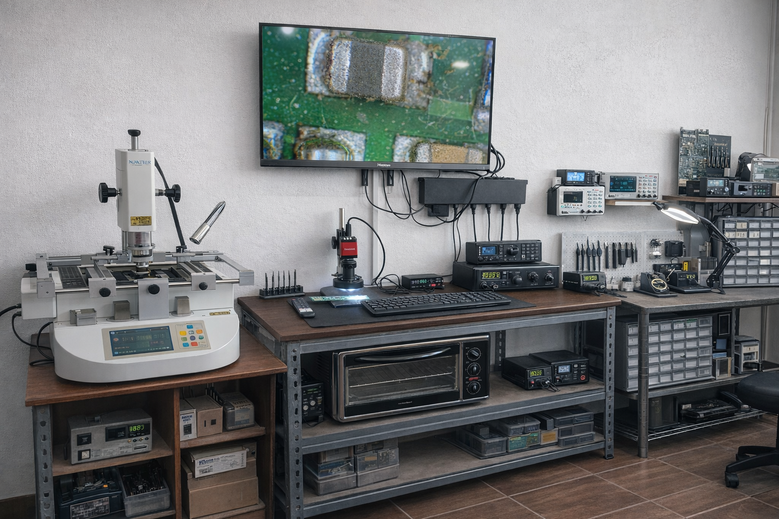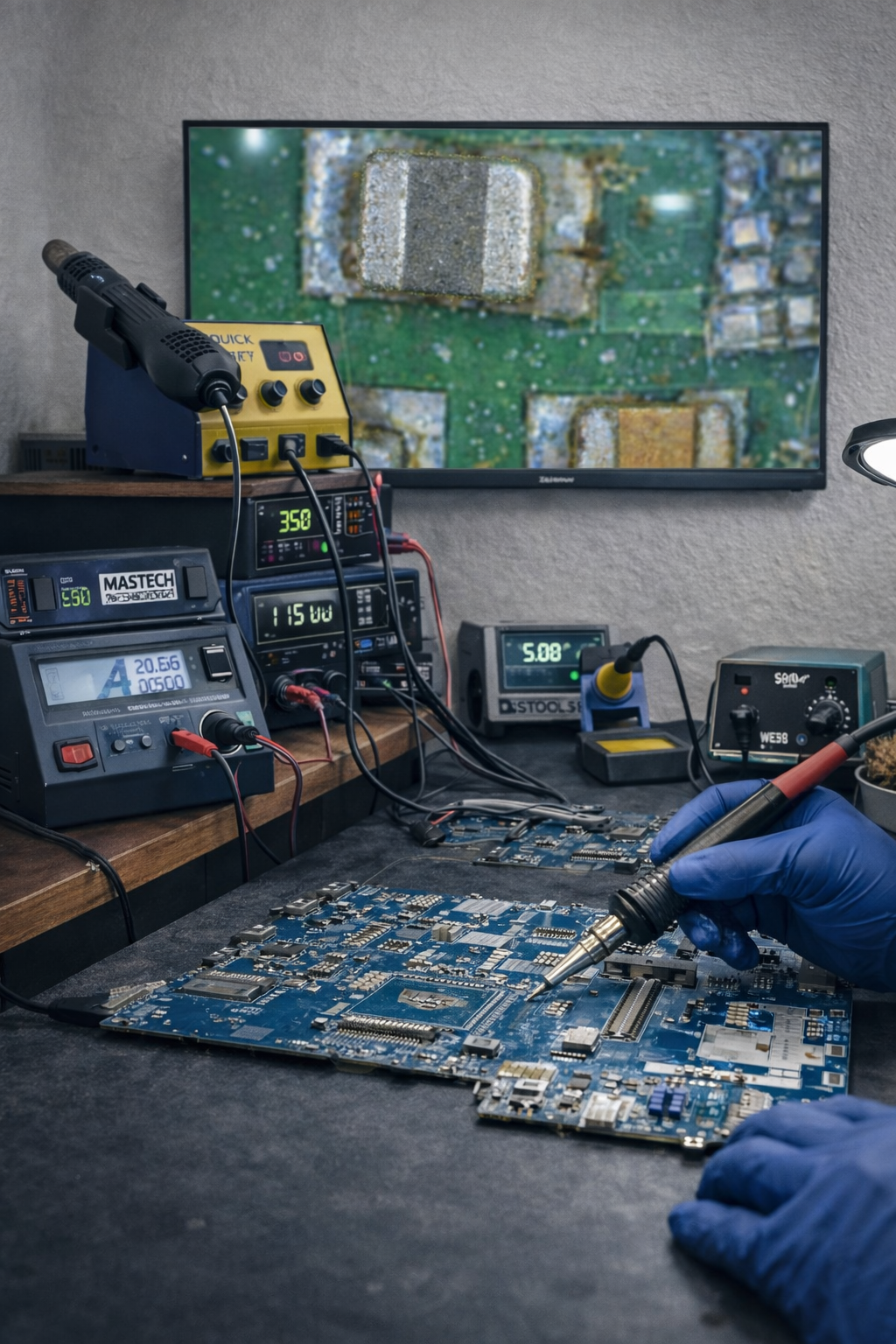 Especialidades: Reparación de computadoras e impresoras • Reballing GPU/CPU • Instalación de redes y cámaras • Mantenimiento UPS • Proyectores • Soporte empresarial 24/7